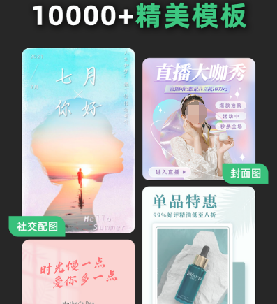 专门的海报制作软件,干软件,有较高知名度,可制作精美的内容,包括招聘、节日海报、产品宣传、促销等等。其中有海量成熟的模板,总有一款适合里面有图标,文字图片等各种优秀的特效,只需简单几步就能打造出视觉效果。各种海报封面任由选择,有独特的视觉效果,打造专属的节日大片。