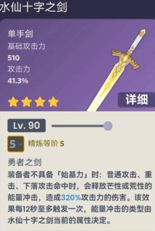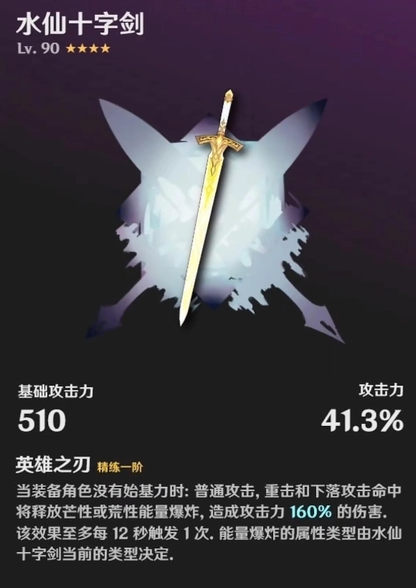 首先第一把新武器是“水仙十字剑”,这是一把四星的单手剑,基础攻击力有510,并且角色装备后,三种形式的普攻都将释放爆炸以此造成160%的伤害,虽然这一效果有冷却时间,但因为精炼能够提升伤害数值的缘故,所以实战中清理起敌人还是挺有效率的。