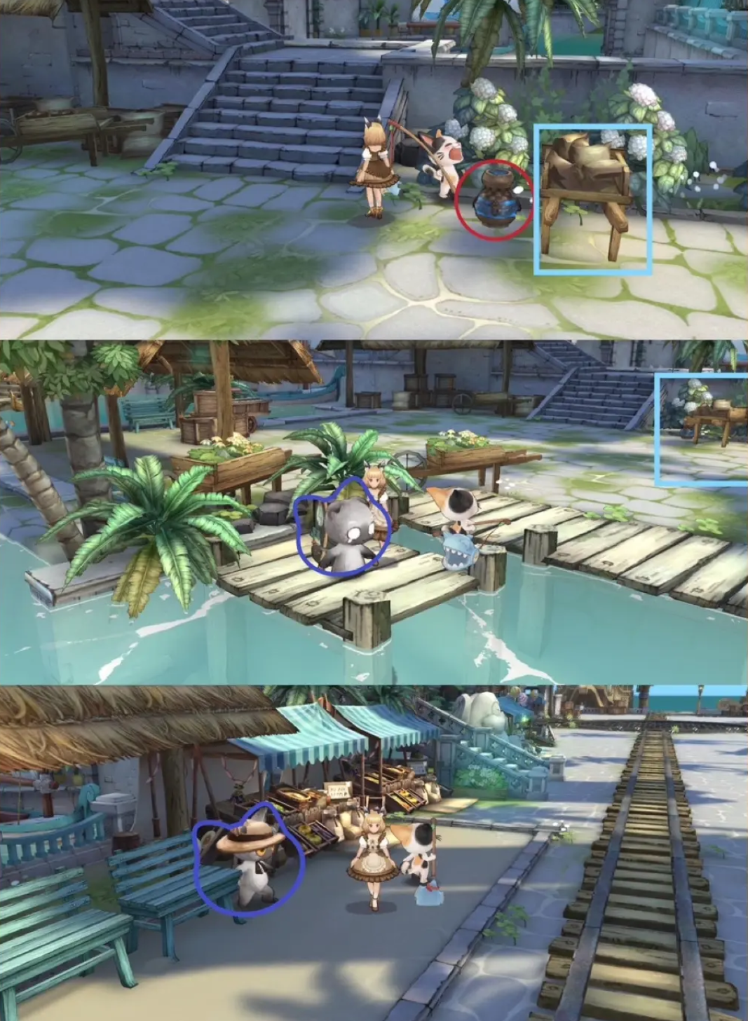 然后又一个摊位在这里,摊位上有很多商品和顾客。在摊位的后面有一只白色的猫咪它是第五只目标。和它互动后然后继续向前走。会看到一个铁轨,铁轨上有很多火车和货物。在铁轨的旁边,有一把椅子,椅子上有一只黑白相间的猫咪,它是第六只目标。互动之后然后继续沿着铁轨走。然后找到传送点,传送到地图的左上角,这里有一个黄色的剑标记,标记的位置是一个小岛,岛上有一座塔。在塔的旁边有一只黑色的猫咪,它第七只目标,也是姆特利海港地图的最后一只猫咪。和它互动然后完成这个地图的任务。