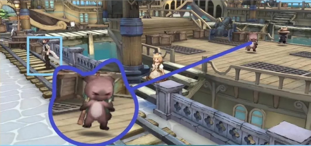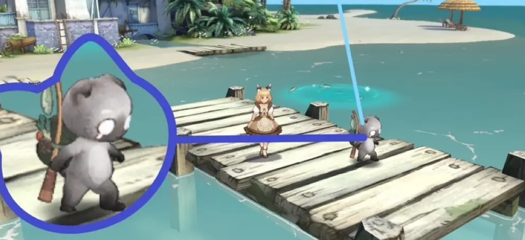 然后要传送到地图的中心位置,这里有一个划船的区域,有很多船只和水面。在这个区域的右边,有一个木制的桥梁,桥梁上有一只橘色的猫咪,它是第四只目标。你和它互动后然后离开这个区域,向地图的左边走。