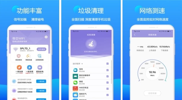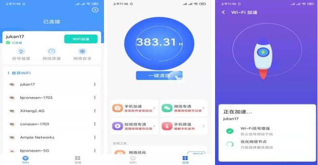 这个软件能帮助用户进行wifi的监控,能让用户“一键连接”,也能对wifi进行安全检测,保护用户在使用wifi上网时的隐私数据。如果手机有卡顿也能用这个软件进行清理和加速。