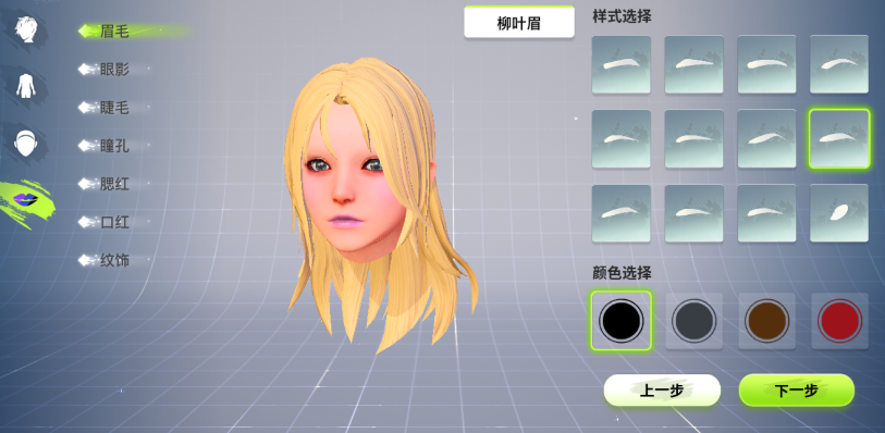 最后一个调整则是五官妆容,当玩家们设定好一些基础的五官参数的时候,大家就可以选择对眉毛,眼影,睫毛,瞳孔,腮红,口红,纹饰这些小细节来进行修正了!