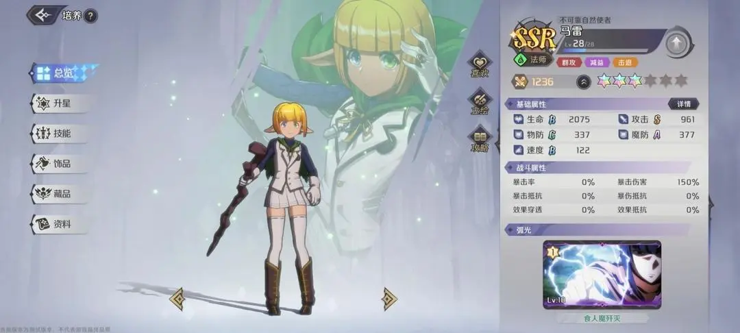 ①马雷:该角色的攻击达到了S,并且由于是法师定位,所以在AOE输出层面会有着不俗表现,虽然速度,生命与物防都比较一般,但技能上的优势可以将这些不足都给弥补。