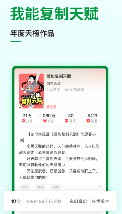 相信这个平台大家都已经熟知了吧,平台中收集了庞大的小说库,大家想要的什么题材都可以找到,就算是冷门的都可以找到,比如同人文、系统重生文、星际穿越、悬疑探案等。而且平台中有很多大神作家,大家读小说的时候可以互动。