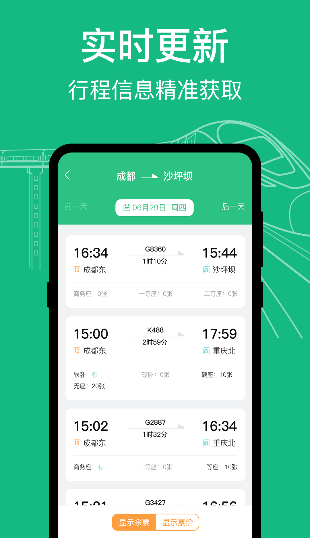 专业的火车信息以及售票信息查询的APP,你只需要将你的起始地与目的地输入,就可以为大家提供出一些非常人性化的方案,这样大家就能够选择自己想要的出行方案了。