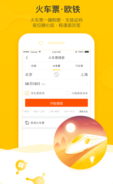 不仅可以满足大家购买高铁票的需求,而且还可以让大家购买火车票、机票、订酒店等等,个性化的推荐能够让大家的旅途更加愉快和欢畅,价格都是非常透明的。