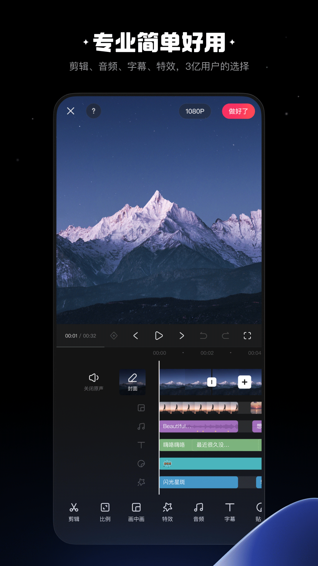 这款app提供强大工具,简化了操作流程,降低了编辑难度,实现字幕、网红溶图、画中画等自动生成,一键创作同款也不再话下,打造出多元化的短视频。