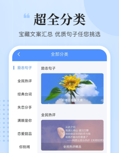 不仅文艺又带有一些知性的文案应用,让用户可以从软件上边看到更多的美妙内容,从而就可以创造出自己专属的文案内容,操作简单又方便。