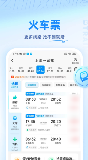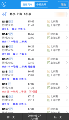 输入出发到达城市之后就会自动为我们推荐合适的线路,除了直达之外在高峰期或者是余票不足时还会推荐一些中转换乘的方案,帮助我们顺利出行。