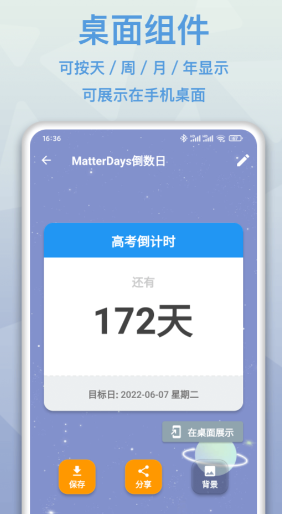 一款颇为专业的计时软件,可以自由调整按照年月日等计量单位来显示,而且还可以根据自己的需求将部分内容通过小组件的形式在桌面上来显示。