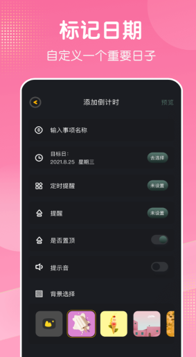 大家可以自由设定一个日期来进行标记,会自动完成已过天数或者是倒计时的计算,还能够确认是否需要提醒以及提醒的具体形式。