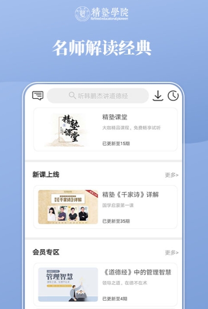 曾经的国学经典文化都是通过私塾教学的方式来传授的。这个软件上提供很多的经典名著资源。通过每天在软件上听一首诗、听一篇文章能获得很多的感悟。