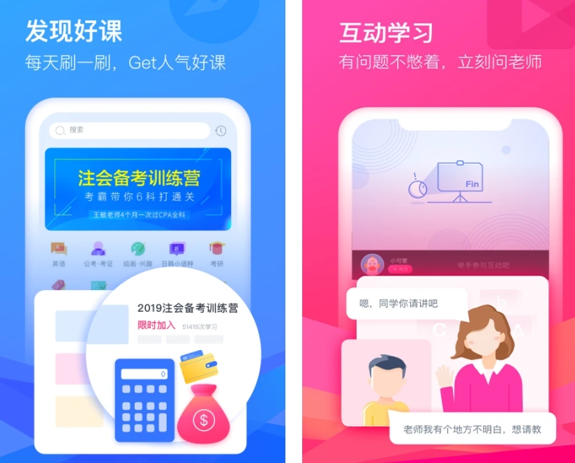 较为大型的综合学习平台,有数十种网课的品类,包括电商营销、考公考证、职场办公、个人提升学历等。直播课程互动有趣,用户可以实时向讲师提问,还原线下的高效学习。