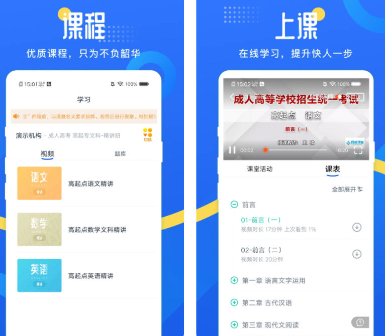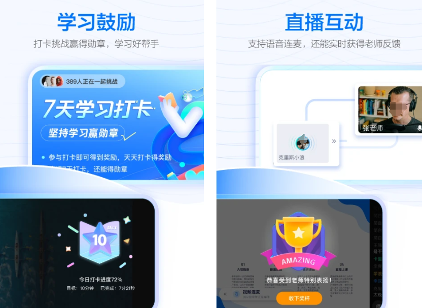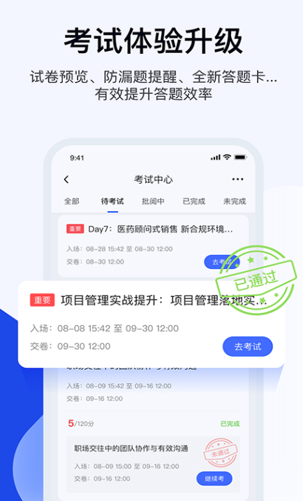 有高效交互与沉浸式上网课的体验,开展全场景学习模式,通过图文短视频以及直播等多媒体课程帮你将学习更加聚焦,还能进行在线考试自测。