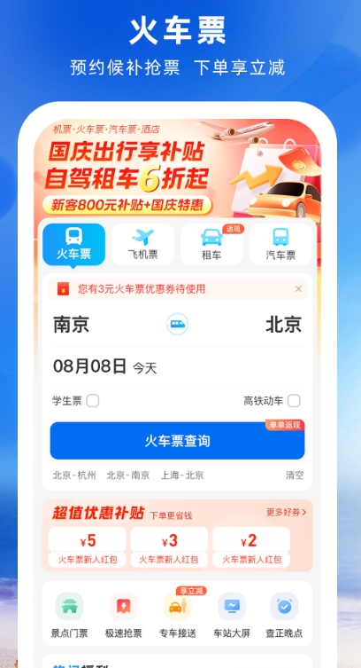 这是新一站的旅行平台,特惠让大家享受不停,每天都享受不重样的景区推荐,机票、火车票、酒店都能够快捷订购,让小伙伴们享受舒适的旅行。