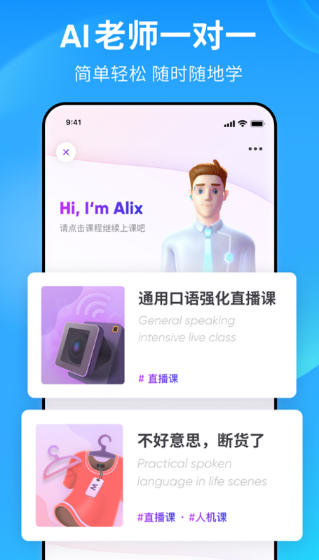 软件中带有智能的AI训练系统,可以做到像和外国人一样的日常对话,而且还带有一些英语的免费口语强化直播课程,帮助我们快速掌握发音技巧和一些独特的案例。