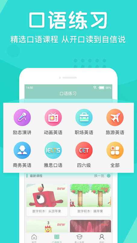 为我们提供了海量的精选口语课程,零基础的小伙伴能够直接通过参与系统化的课程来掌握基本的音标知识和对应的发音,还会带有诸多不同模式的口语练习帮助大家进行巩固训练。