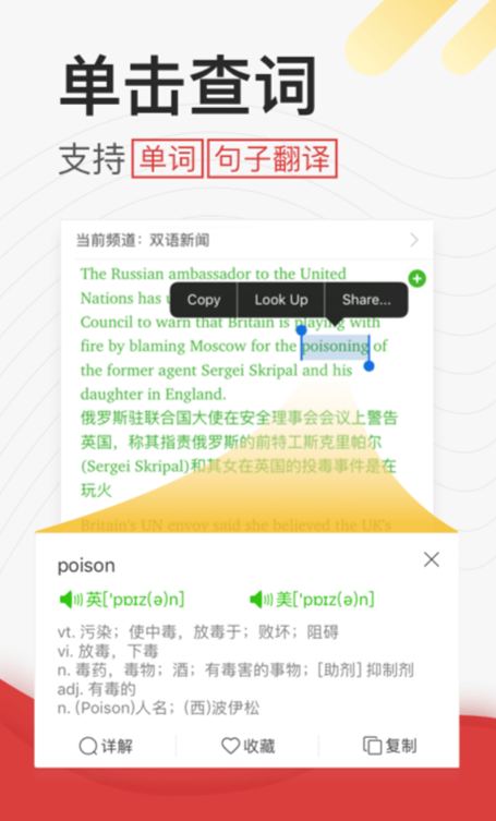 软件通过提供大量的单词、听力、口语练习从而让我们快速理解句子释义,而且还带有众多的英文资料供大家获取,可以通过选中单词来进行翻译和读音示例,更是带有众多的频道内容可以一键体验。