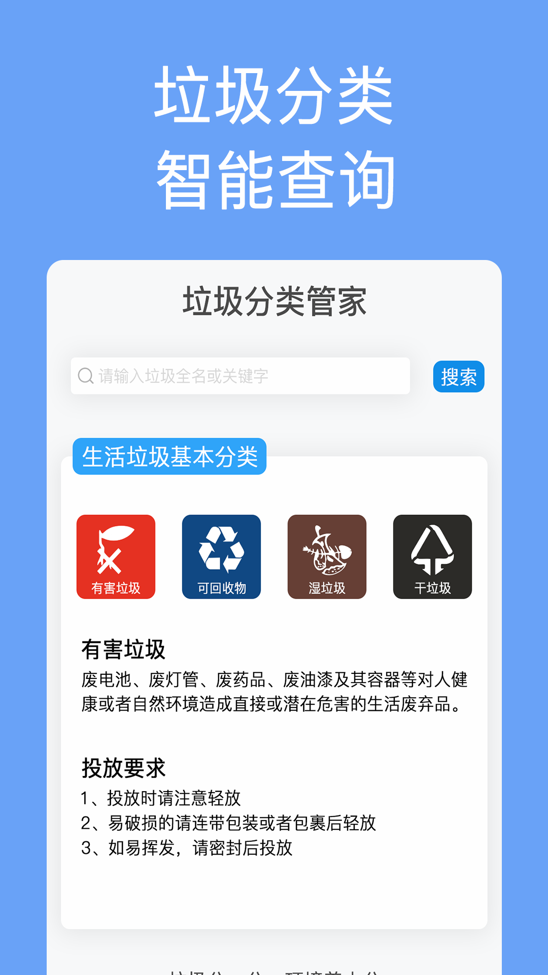 在垃圾分类手册这款app上,大家在使用的时候,可以输入垃圾的名称,查询垃圾分类,可以帮助大家更好的完成垃圾分类这一项工作。