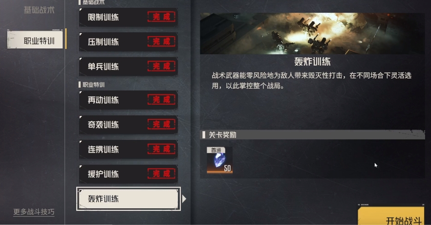 轰炸训练其实是在职业特训当中可以体验到的一个关卡,大家在参与轰炸训练的时候需要利用战术武器给敌人带来伤害,在上面会出现各种不同的地形,如果大家想在上面掌握优势的话,其实整个战局都是可以依靠道具来掌握住的,在轰炸的过程中大家需要注意火箭打出的范围基本都是3*3的范围。