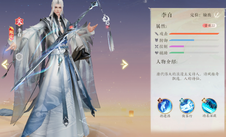 华佗在游戏中属于一个辅助职业,而且是目前游戏中一个属于TO职业的奶妈了,自身的技能可以给队伍中的两个角色回复大于自身血量的生命值,不仅如此,被动技能还可以让敌人或者一个接木效果,这会让华佗受到的伤害转移一小部分给敌人,这个就非常的变态了,而李白是目前游戏中比较强劲的输出职业了,自身的技能可以对竖列的敌人造成高额的物理伤害伤害;最关键的是,自身的大招,在释放的时候,如果敌人的血量非常高的话,那么可以额外提升一部分的伤害,那么即使对方前排是一个非常给力的门客的话,经过2回合,李白释放大招后,基本就可以带走一个了!