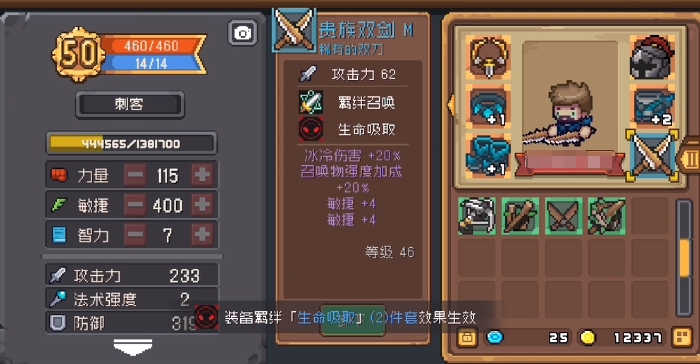 防具和饰品装备这块没有特殊要求,只需要结合装备和刺客本身的特性来凑齐一些羁绊即可,武器的话有两种选择,第一种是比较平民的“贵族双剑”,当然,普通的贵族双剑肯定不够用,你至少得把它进行一定程度的强化和附魔才行。