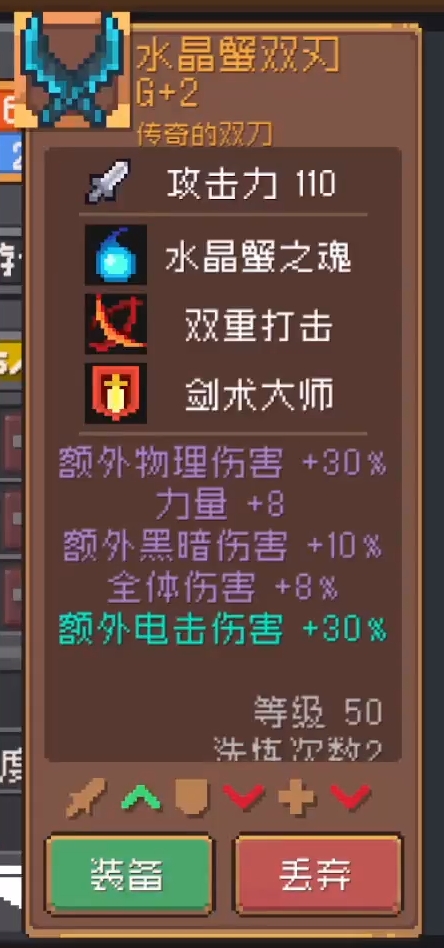 当然,如果你有幸能获取boss系列装备,那么也可以直接选择穿戴“水晶蟹双刀”作为自己的武器,这把武器作为传奇品质武器,基础属性所提供的攻击力比贵族双剑更高一些,而且它的羁绊也都是二周目刺客能够用得上的。