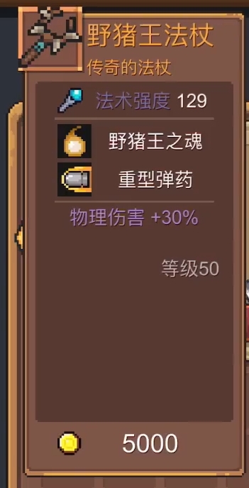 野猪王法杖:这把武器的话推荐给各位玩法师职业的朋友,它的基础属性虽然比较单一,但提供的129法术强度,无论是从数值来看,还是从它对于法师职业的契合度来看,都是非常不错的。