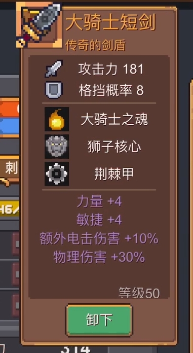 另外它自带的技能也都是比前面几个要多的,其中大骑士之魂可以让你的攻击偶尔造成重击从而打巨额伤害,狮子核心则同时提供伤害与防御侧的加成,荆棘甲还能给敌人反伤,实战中的近战输出表现因此大大提升!