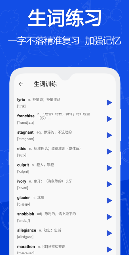 软件会针对我们学习的新单词提供双语例句,让我们能够快速理解,更是通过大量的习题训练加深对单词用法的掌握程度。