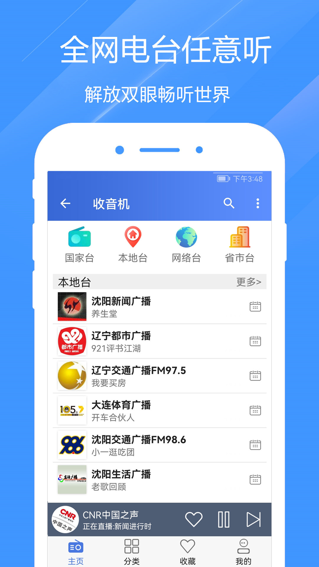 这款收音机是一个拥有大量电台,而且不需要插耳机就可以收听各种网络收音机的软件。其中的频道包括了新闻电台,国家电台,省市电台,网络电台,交通广播,音乐广播等等。而且它还有分类齐全的导航。以及超过1500个国内FM广播电台。可以24小时不间断直播。