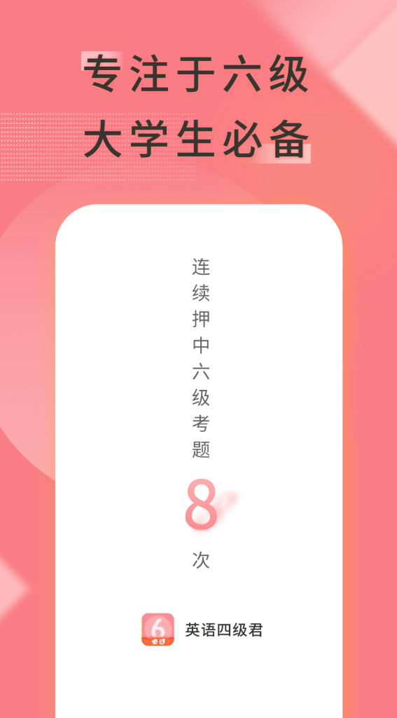 六级是许多学习英语的同学的门槛,同时也是很多朋友想通过的考试,这款软件则根据六级的考点进行专门设计,让大家能很快通过考试,拿到证书。