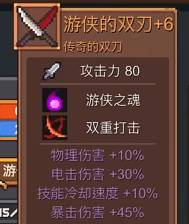 游侠的双刃:在形状上它和刺客常用的那些双刀是比较像的,不过颜色和外观还是有着很大区别,刀刃颜色更是一红一白,在属性上,它只单纯的提供攻击力,一开始只有两位数的攻击,但随着不断强化,攻击会来到一个尤为可观的数值。