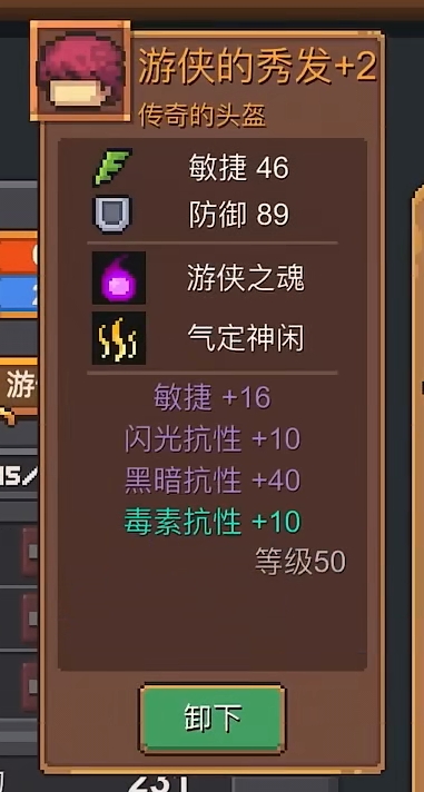 游侠的秀发:这也是一个外形十分独特的头盔,说是头盔,但它实际上就是一头红色的假发,戴在头上非常的帅气,属性方面它也可圈可点,与披风一样都同时提供了敏捷和防御两项实用的属性,虽然相比披风低了一些,但两者结合正好可以相得益彰。