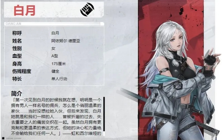 第一个就为大家解读一个重甲类型的角色,就是白月,她的生存能力是非常强的,目前出现在搭配阵容中的效果非常不错,出现的几率也比较高,而且可以放在前面抵御敌人的前进速度,她的高级面板数值也可以为大家挑战多种战役,而且目前她的损伤效果也是接受能力比较高的,所以她换各种部件的时间会比较长,不用大家特别的去挑选各种部件来进行搭配,所以算是比较好培养的一个角色,新手时期比较实用。