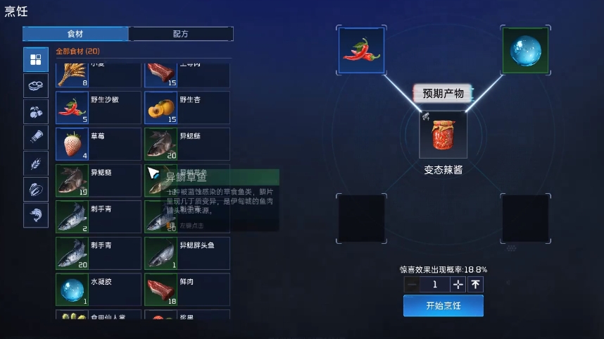 需要大家提前准备一个变异果加上浆果,然后搭配蜂蜜以及水就可以制作成功啦,在大家打一些比较难的小怪时就可以提前吃这几个菜肴来增加自己的生存机会啦,如果是想要自己防御效果更强的话,其实在上面也可以选择制作菠萝咕咾肉,这个菜肴的材料在游戏中是比较好获取的,一个肉类加上两个菠萝之后在搭配一个小麦,就可以制作完成啦,在上面使用的时候就可以提升自己护盾恢复的效果啦。