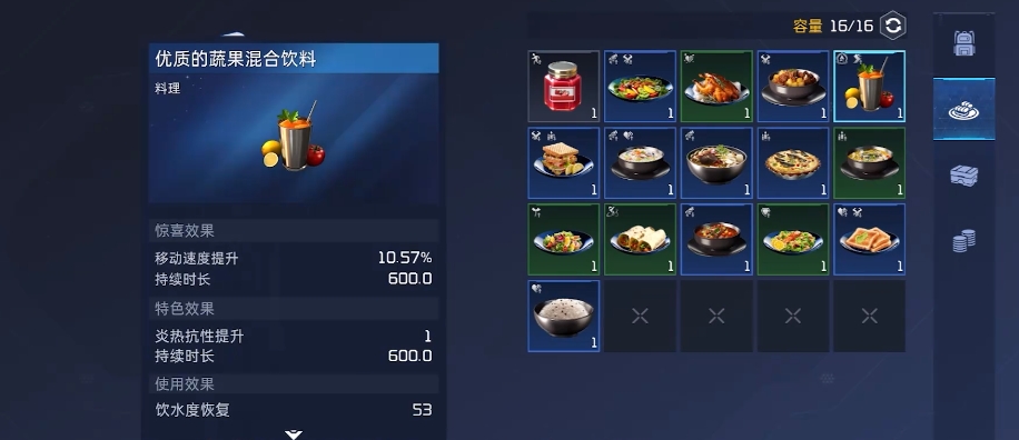 如果想要时间稍微长一点,但是又不想去获取各种食材的话,大家还可以制作营养米饭,这个菜谱在游戏中其实就是利用水加上小麦制作成的,但是在上面用到的水跟小麦都是需要两份的,这样的菜肴比白开水提升速度的时间会稍微长一点,其次想什么青菜炒河鲜或者是鱼泥沙拉之类的食物基本都是增加速度的,很多的鱼类食材在加工之后都是可以带来速度提升效果的哦。