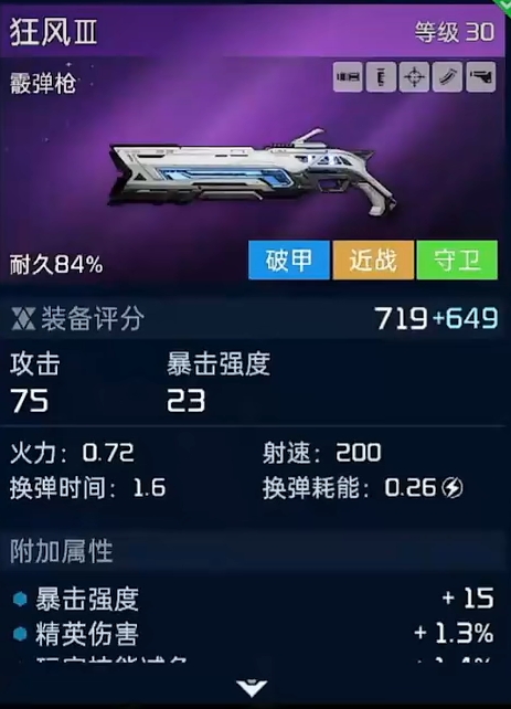 然后它在属性层面,攻击和暴击都非常可观,此外,它就算横向对比同类型的其他霰弹枪,优势也非常明显,前面提到的射速快就不说了,关键该武器它还能够同时提供不俗的护盾,并且也自带位移,机动性算是一点也不落下。