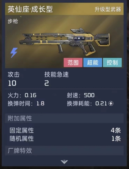 英仙座·成长型:该武器是首充送的一把升级型武器,使用的时候不必浪费过多资源去强化,因为可以直接跟着主角的升级而不断提升。