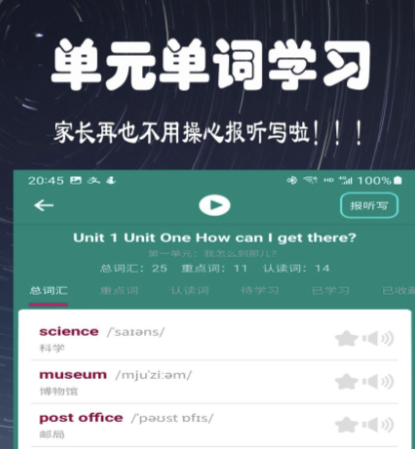 软件将课本的内容全部都同步到了手机荧屏上边,从小学到初中所有的教材应有尽有,自带的点读功能让你可以清楚的了解每一个发音,从而提升你的听力能力。