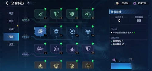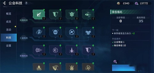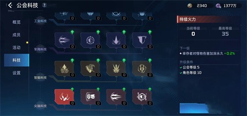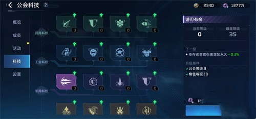每一类科技都有多个项目,每个项目都有不同的等级和效果。公会科技的解锁条件是公会等级,公会等级越高,可以开启的科技项目越多。公会等级的提升主要靠公会成员完成公会日常任务和公会活动。