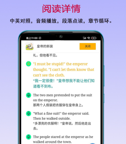 这主要是专门进行外语阅读的软件,里面有中英对阅以及音频播放章节循环内容,如果在读第一遍的时候,自己并不能了解的话,就可利用章节循环的方式来多次收听。既可以增长外语的学习能力,里边还有实时翻译等功能,通过该软件的阅读可以增长外语词汇,有很多的外语学习视频内容非常的丰富。