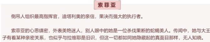 铃兰之剑的之中索菲亚以其冷酷而优雅的形象脱颖而出。她不仅是倒吊人组织的最高指挥官,也是迪塔利奥的得力助手。那么铃兰之剑索菲亚怎么样?小编就来解读一下。主线之中索菲亚与大王子的神秘关系和与拉维耶的过往纠葛都让这个人物有着十分神秘的故事背景。接下来小编来分享这位角色,并提供一些游戏中的实用技巧。