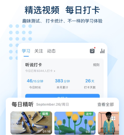 在学习英语的时候,需要通过听说读写等等各种各样的方式,才能够提升英语的综合成绩以及英语的学习能力。该软件拥有着海量的资源,每日还会不断的更新,也有精品的视频内容,每日打卡的方式就能够让自己在听说读写等等方面都能够得到训练。如果想要进行趣味配音的话,这里面可以对各种外国大片进行配音,感受自己声音的魅力。