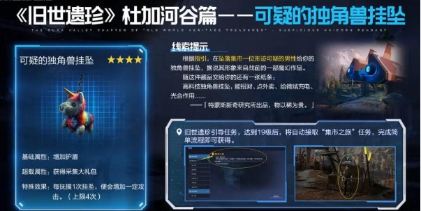 首先如果大家是在杜加河谷的话,第一个可以获取的就是可以到就是独角兽挂坠这个遗珍,这个遗珍的话是大家在19级的时候就可以做的任务,在上面需要大家通过完成这个任务来获取,获取这个遗珍之后,大家可以为自己增加一定的护盾值,并且获取采集的大礼包。