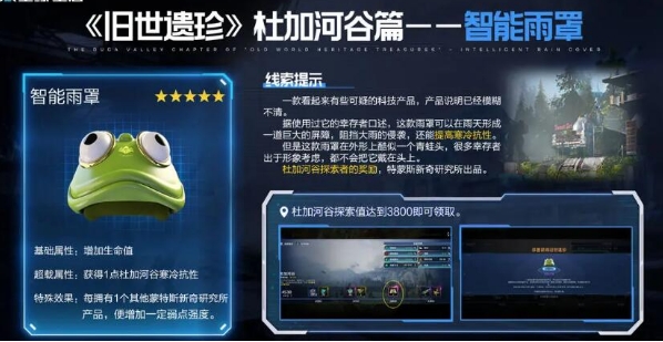 第四个就是智能雨罩,智能雨罩这个遗珍是比较不好获取的,需要大家在后期才可以拿到。因为跟大家的地图探索值有关,杜加河谷这张地图探索值一旦达到3800分的时候,大家就可以直接获取智能雨罩,这个五星级的遗珍它带来的效果则是为大家增加一定的生命值,而且在上面带来的寒冷抗性也是非常适合后期的地图来使用的。