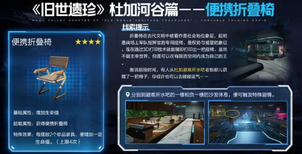 第五个遗珍就是便携折叠椅,这个遗珍大家可以去避难所来寻找,当然了,这个避难所里面大家可以寻找到多个遗珍,之前的那个是在负一楼,而这个遗珍是在一楼和负一楼上面都有机会获取,大家不管是在哪一层,只要触发相应的剧情,才能获得,虽然这只是一把四星的遗珍,但是他增加的生命值效果还是非常好的。第六个就是抽象的艺术,抽象的艺术这个遗珍也是属于不好获取的。