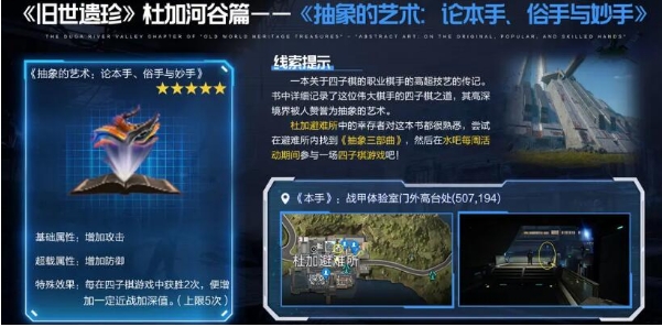 在获取的时候需要大家在固定的时间才可以进行参与,需要在每周二的晚上8点到9点之间去参与休憩时光这个活动,在参与这个活动的时候,大家可以来到避难所的水吧周围,这时候会出现一个四子旗的NPC,大家跟他进行对话就可以获取本手、俗手和妙手这三个道具,获取了道具之后,大家就可以合成抽象的艺术这个遗珍了,难度比较大所以这个遗珍在游戏中的效果也是比较好的,达到了五颗星,带来的属性既可以增加攻击,又可以增加防御,目前也算是效果比较好的一个遗珍了。