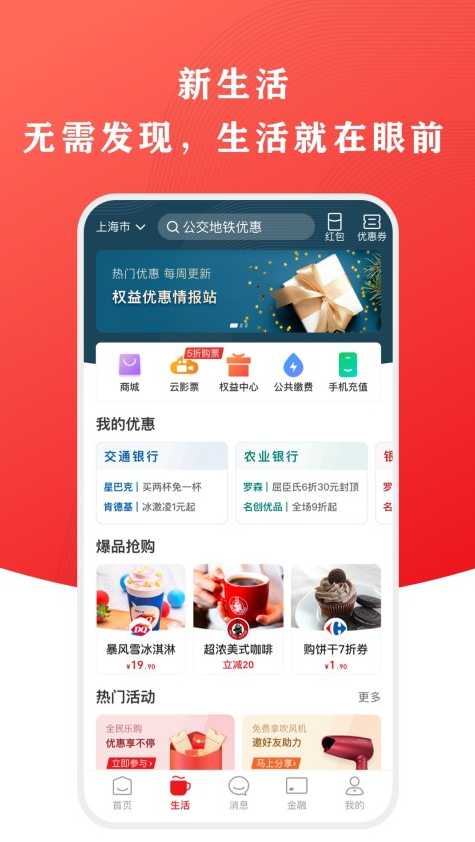 交通银行出品的非常好用的一体化支付工具,除了在线下扫码转账功能以外,还可以在软件里直接点外卖、购物,让大家有智能生活的感觉。