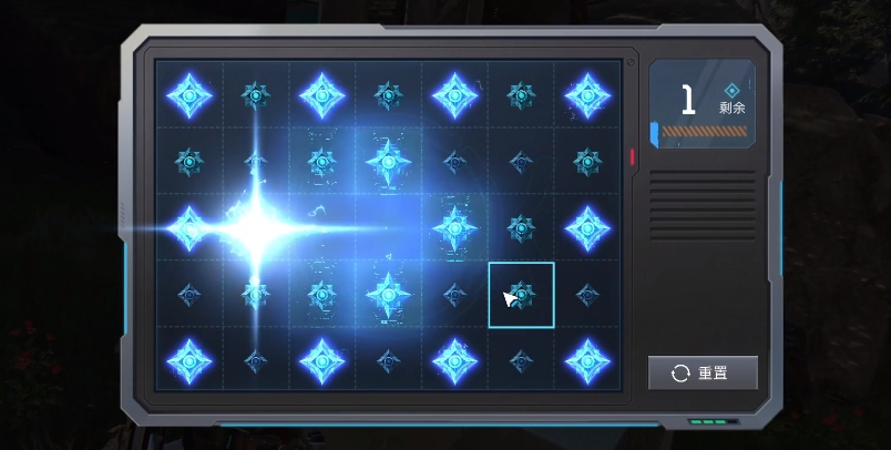 进入解锁的画面之后大家先引爆中间的这个方格,这个是一般大家打开磁能锁之后的第一个步骤,在将中间格子引爆之后大家就可以观察一下左边以及右边的格子,这里是建议大家先引爆左后的,大家可以随机选择左边的格子或者是右边的格子。